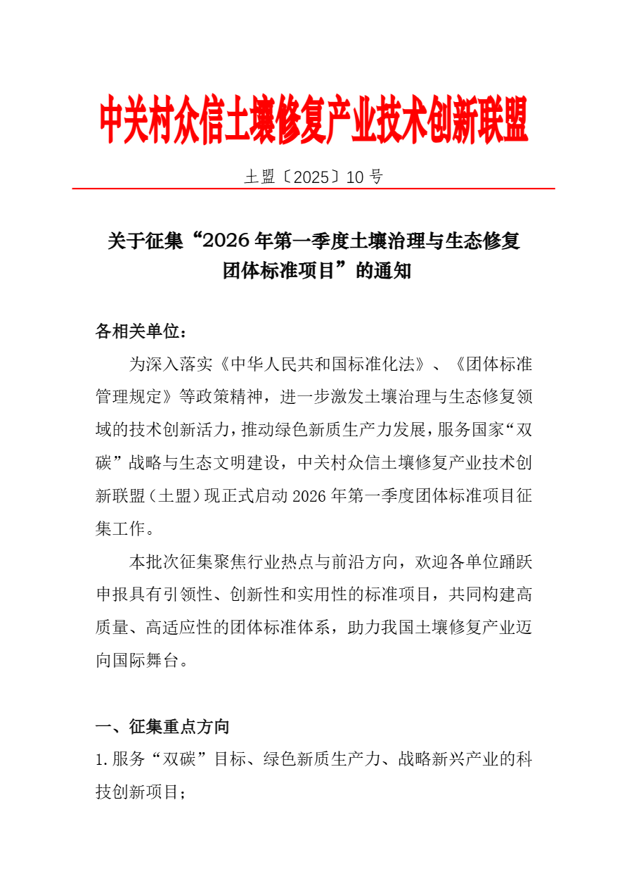 在绿色发展的浪潮中,谁掌握了标准,谁就掌握了行业主动权中关村众信土壤修复产业技术创新联盟现已启动 2026年第一季度团体标准项目征集,诚邀具备技术实力的科研院所、高校、企业,共同制定引领行业发展的团体标准。